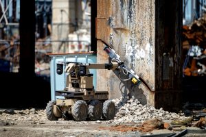 We quickly developed a system in which the small Chevettes were used as a mobile pair of eyes. This allowed operators to have more angles of view and the ability to zoom in on areas which the larger R-Evolve and Reacher were working on. The Brokks lacked cameras altogether and were being operated beyond where the operators could see, so instructions were relayed by radio by the Chevette operators who were working out of an ISO container. Watching a ‘crude’ Brokk reach forward and snip a piece of re-bar that was poking out of the ground and too small for the operator to see was an amazing thing. Meanwhile, the Army team with the Lightweight Tractor were put to work clearing the piles of crushed concrete that had been placed against the columns to allow our own charges to be placed accurately.